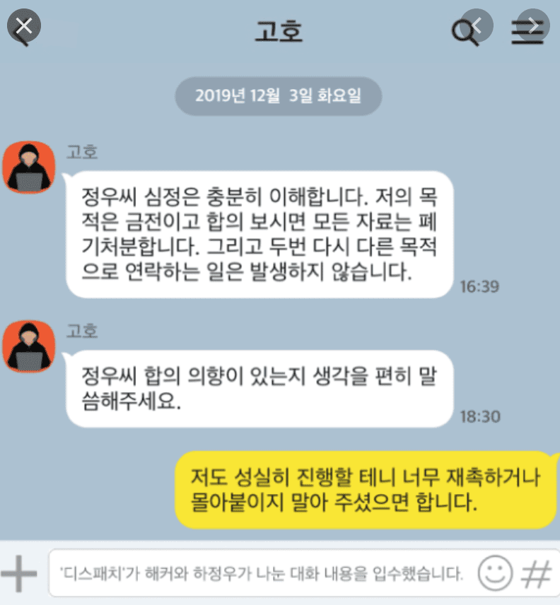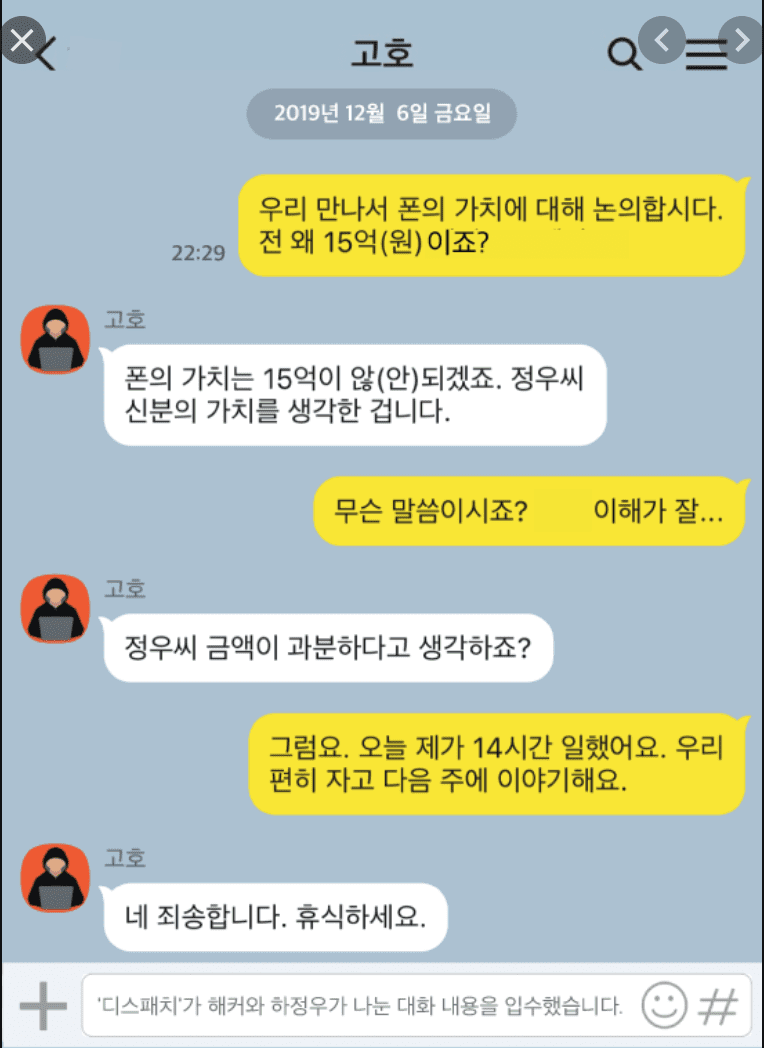 해커 (고호) 는 하정우의 핸드폰 해킹에 대한 보상으로 15억을 제시했고 하정우는 13억원까지 협상을 하는가 하면 가해자를 상대로 말을 놓고 펭수 이모티콘(펭하) 를 사용하는등 누가 피해자이고 누가 가해자인지 헷갈릴정도로 고호(해커) 와의 대화을 이어 갔습니다.