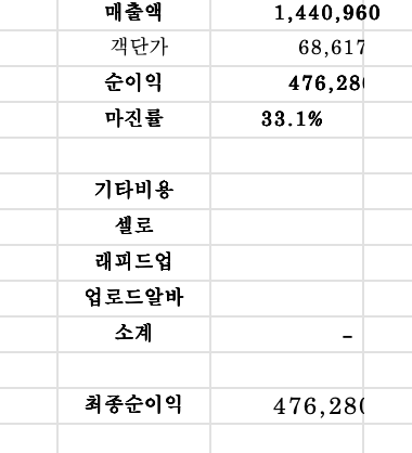 평균 마진을 20% 때로 맞추고 싶었으나 이번달은 생각보다 높은 30% 마진때였습니다. 좀더 낮출수 있도록 하고 스마트스토어 판매를 좀더 늘릴수 있는 방안을 모색해봐야 할것 같습니다. 사업자도 추가 해야 할텐데 요즈 등록 마켓수가 줄어 걱정이 되긴합니다.