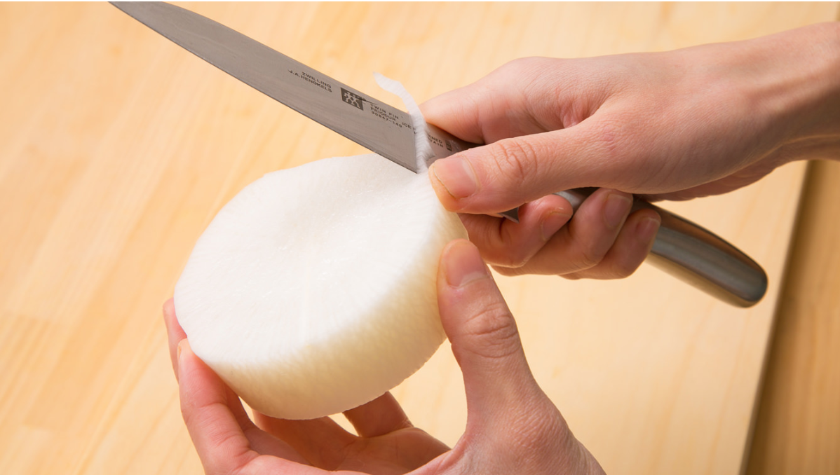 무는 두껍게 둥글게 썰어서 껍질을 벗기고, 모서리를 칼로 한 바퀴 자릅니다.냄비 안에서 무끼리 부딪쳐 자빠지는 것을 방지할 수 있습니다.
