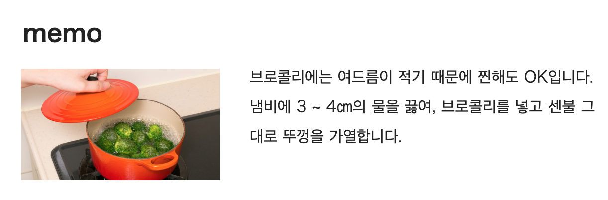냄비에 물을 끓여 소금 (1 ~ 2 %)를 추가한다. 줄기를 먼저 넣고 1 ~ 2 분 지나면 꽃 봉오리 부분을 친다.