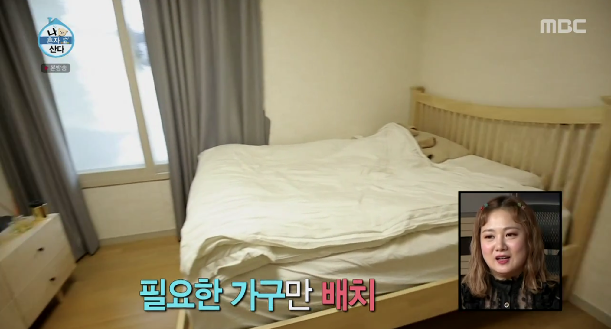 장도연 아파트는 2평이며 특별한 가구가 없어 아늑하고 넓어 보이는 효과를 주고 있습니다.