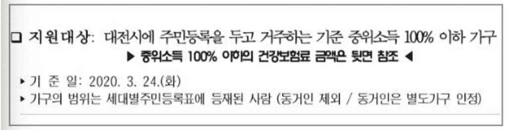 대전형 긴급재난지원금 은 대전시에 주소를둔 지역민을 대상으로 이뤄지며 중위소득 100% 이하 가구를 대상으로 지원 합니다. 지난달 3월 24일기준 자신의 주소지가 대전지역에 속해 있어야 하며 지급금액은 가구원수 에 따라 차등 지급됩니다.