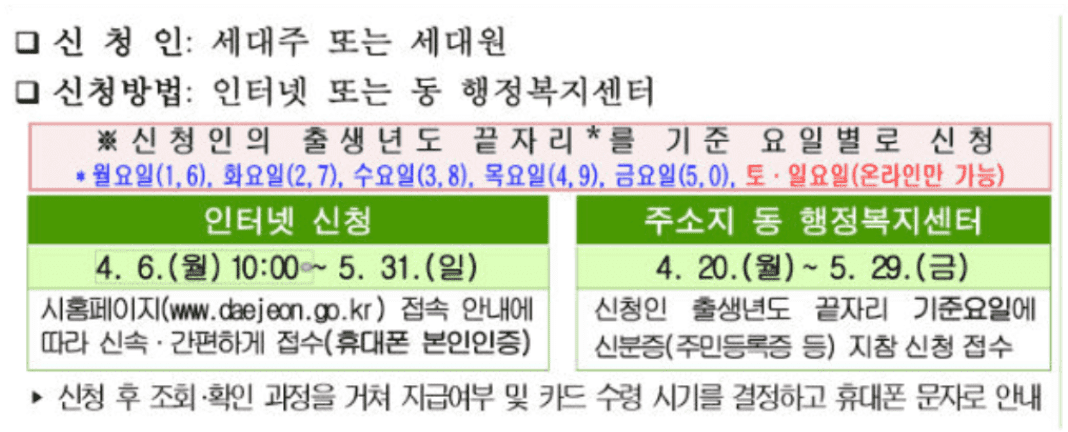 대전 코로나 지원금 직접방문 수령은 코로나 바이러스 확산 방지를 위해 요일제 신청 가능합니다.