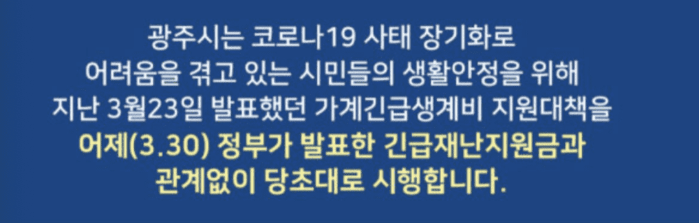 2020년 3월 30일 정부에서는 긴급재난지원금을 발표했고 광주시에서 역시 광주시민을 위한 긴급재난지원금을 지원 하기로 지난달 31일 발표 했습니다.