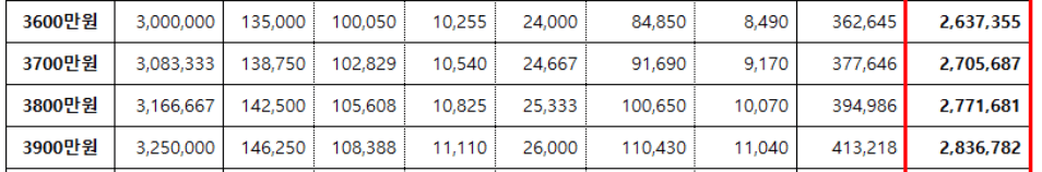 연봉3600~3900 구간에서 월평균급여 및 세후 급여에 대해 확인하겠습니다. 연 3600만원은 월 300만원 세후 263만원 수령 연봉 3900만원은 월 325만원 세후 283만원 수령가능합니다.