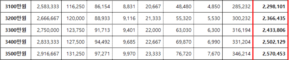 연봉3100~3500 만원일경우 직장초년생보다 기본적인 연차가 있는 근무자라 생각되며 연봉 3100만원은 월 258만원 세후 229만원 연봉3000만원 일경우 291만원 세후 257만원 수령 할수 있습니다.