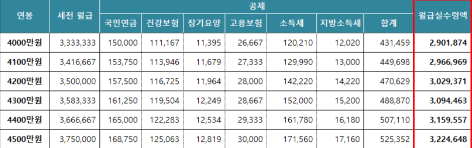 연봉 4000만원 기준 세전 333만원 세후 290만원 이며 연봉 5500만원일때 세전 458만원 세후 385만원 수령 할수 있습니다.