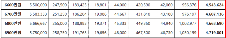연봉 6900만원 지금시 월 575만원 세금공제시 471만원 수령 가능 합니다.