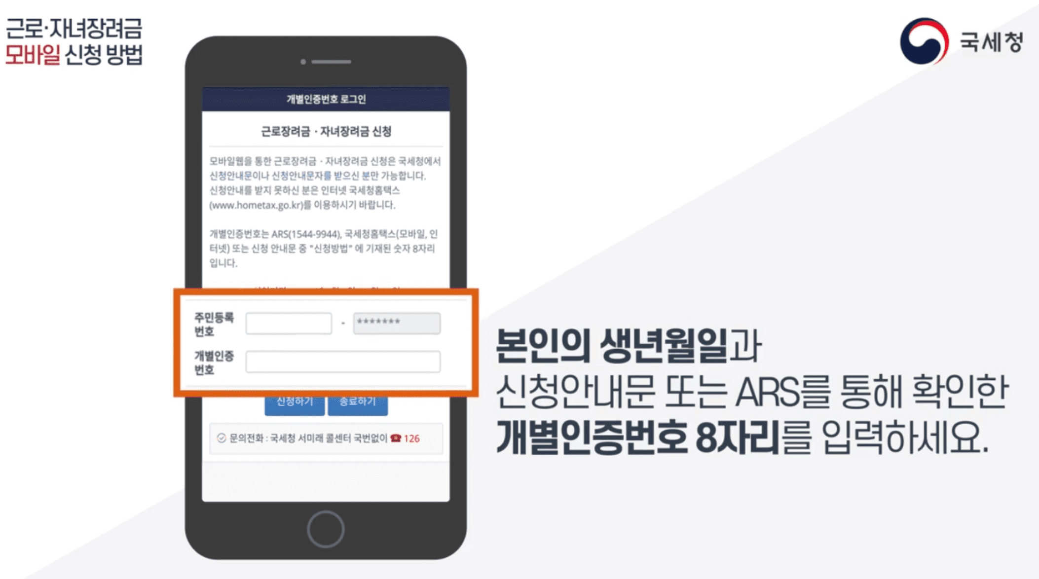 4. 본인 생년월일, 개별인증번호 입력