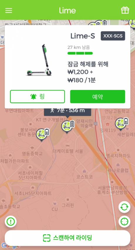 라임 이용시 지도상 정해진 곳에서만 이용 가능하며 이외 이탈시 추가운임요금이 발생할수 있습니다. 꼭 참고 하세요.