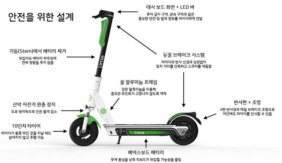 10인치 2.125타이어와 약 500w의 모터를 뒷바퀴에 장착해 힘들이지 않고 단거리 이동에 탁월 합니다. 보통의 전동 킥보드의 경우 폴딩기능이 장착된 반면 라임은 렌탈용으로 제작되었기 때문에 폴딩기능을 제공하지 않습니다.