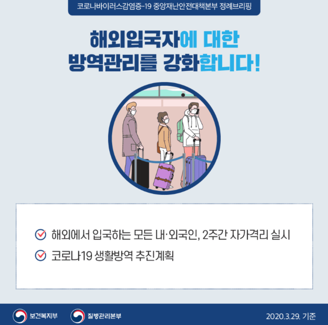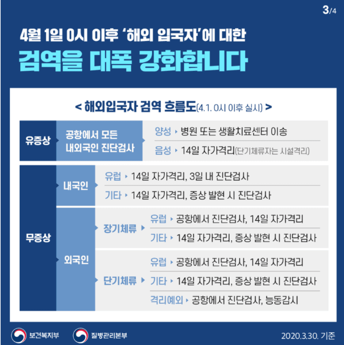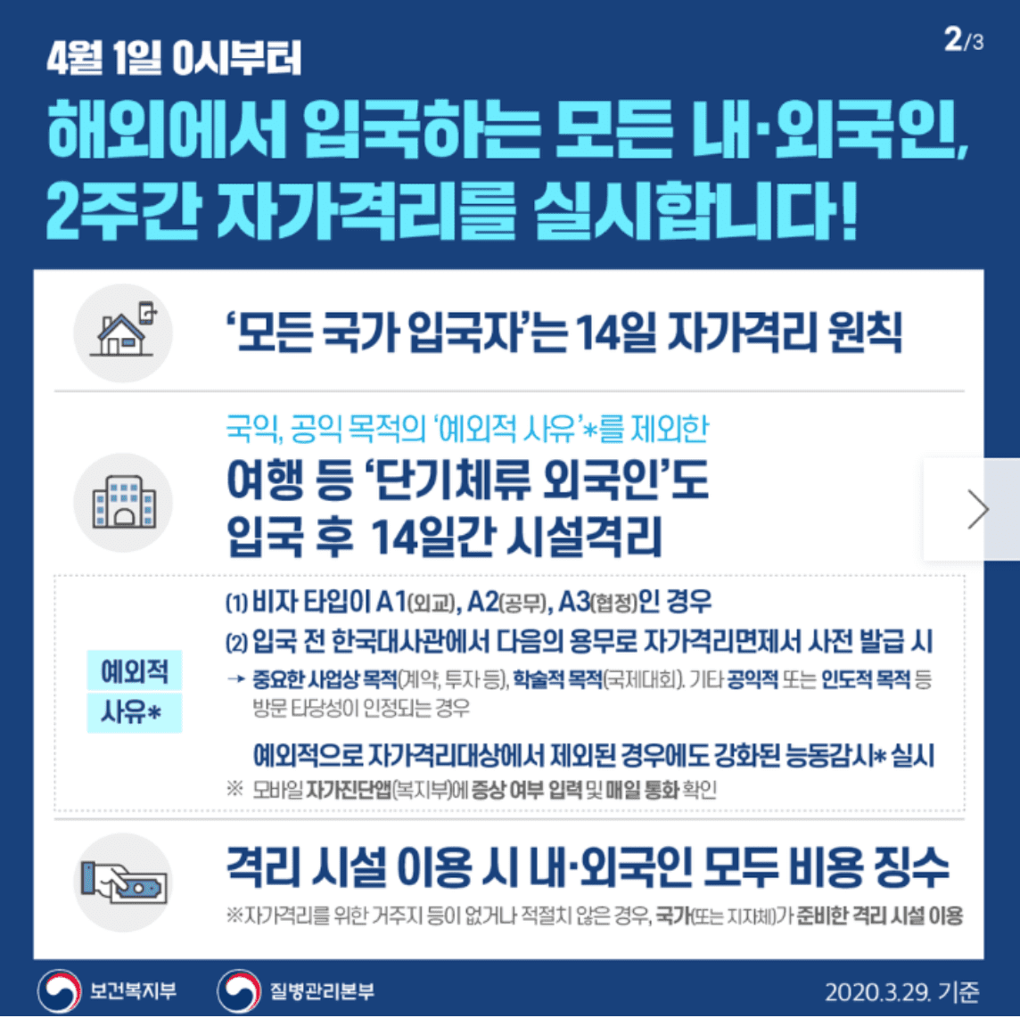 4월 1일부터 해외에서 입국하는 내 외국인 모두 2주간 자가격리 해야 합니다. 국내 거주지가 불분명할경우 제공되는 격리시설에 수용됩니다. 그동안은 자가격리 없이 능동감시만 실시했었지만 이로 인한 피해가 많았던것이 현실입니다. 이로 인해 내외국인 할것 없이 해외입국자 모두 (단기체류자) 2주간의 자가격리를 실시합니다.