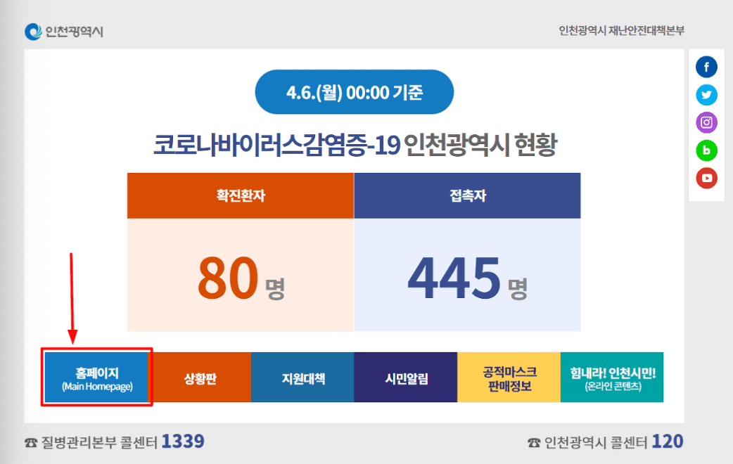 코로나 바이러스에 대한 보다 자세한 사항은 질병관리본부 콜센터 1339 또는 인천광역시 콜센터 120 으로 연락하시어 정보를 받으시길 바랍니다. 코로나바이러스가 하루빨리 종식되길 바라며 이글을 읽으시는분들 모두 건강하시길 바랍니다. 이상 글을 마치겠습니다.