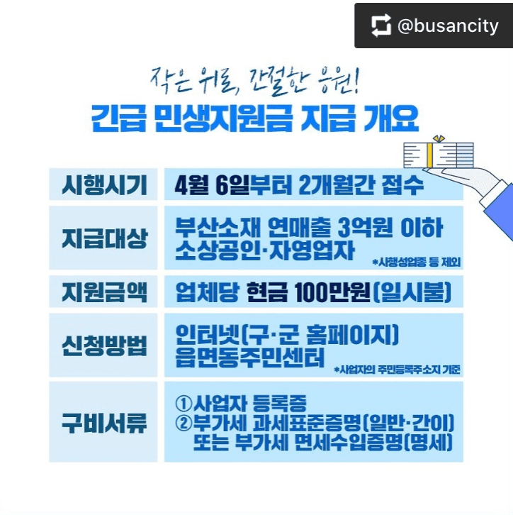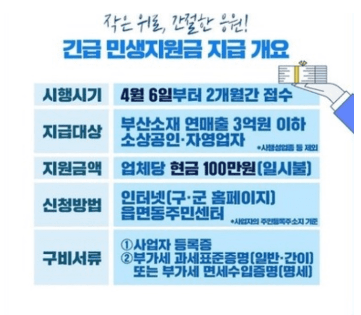 2020/04/09 - [분류 전체보기] - 부산 영세소상공인 민생지원금 100만원 신청방법