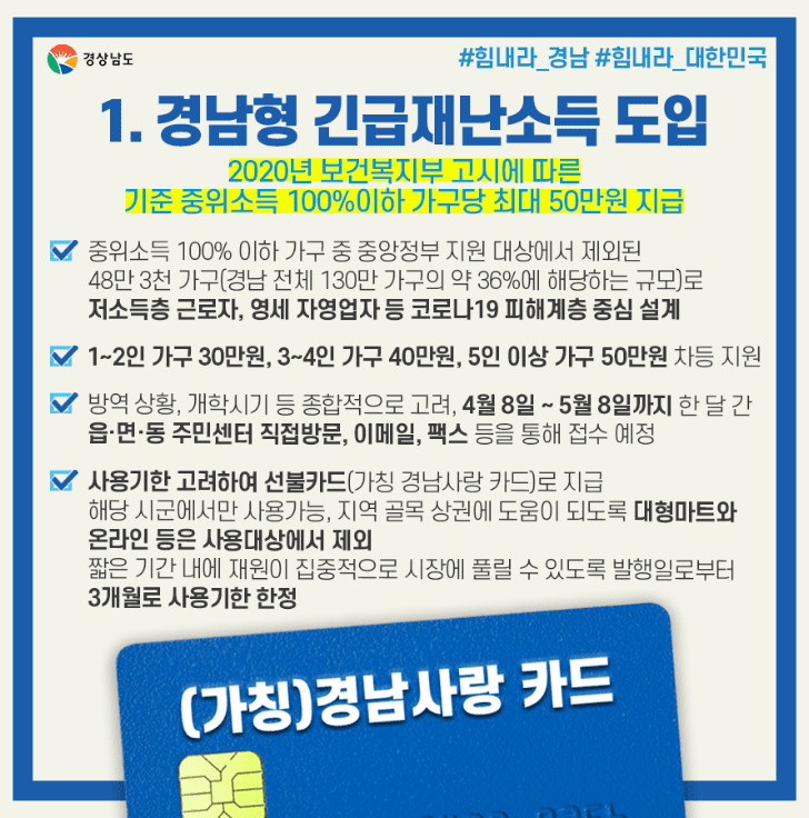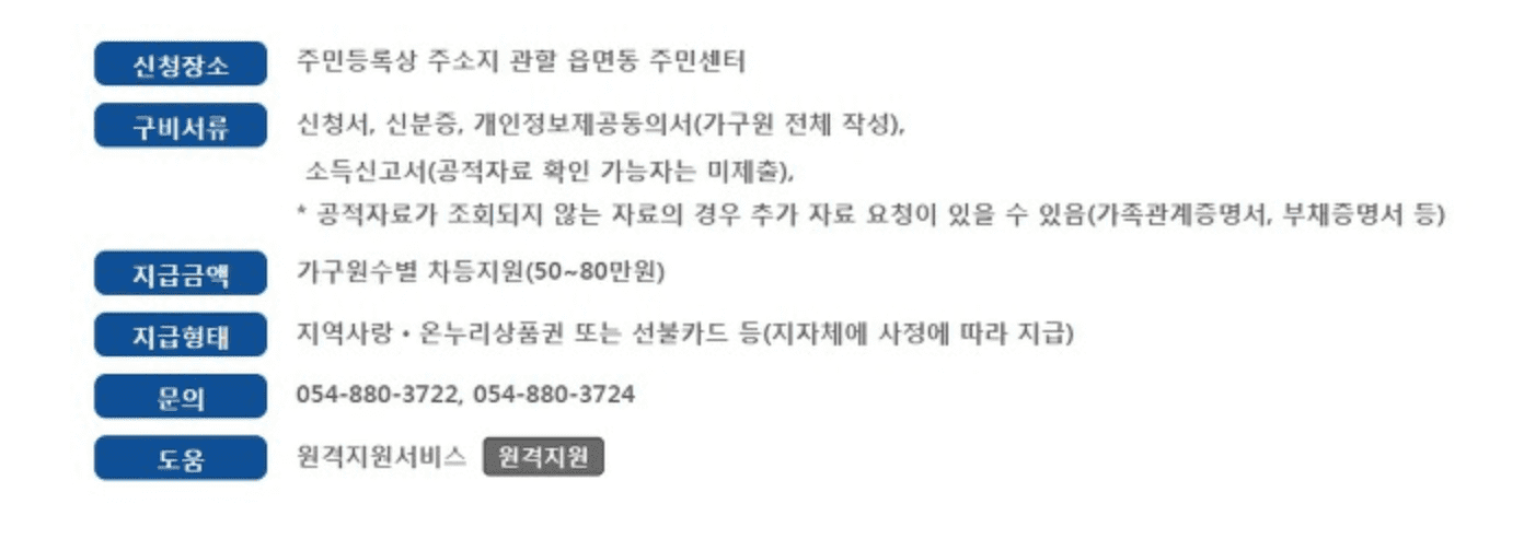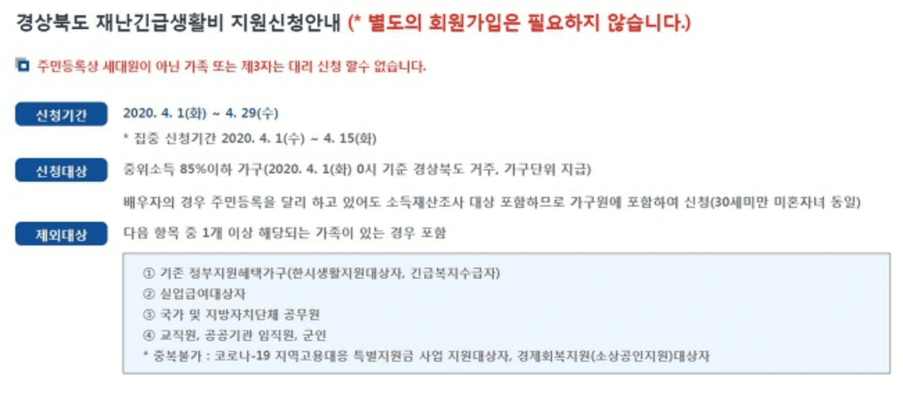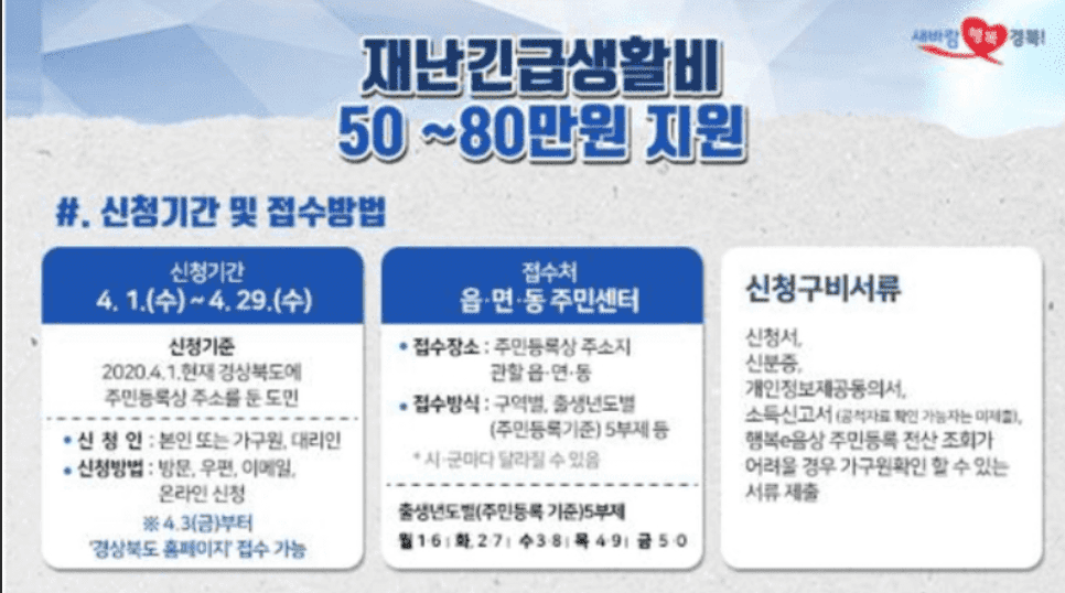 대한민국 정부에서는 지난달 30일 긴급재난지원금 지급을 발표했으며 경북역시 지역민을 위한 코로나 바이러스 지원금을 지원하기로 했습니다. 이는 침체된 지역경제를 살리기 위한 정부 지원 자금입니다.