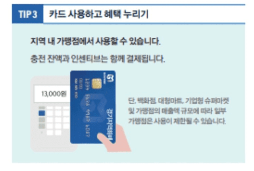 연간매출 10억원 업체 , 대형마트, 인터넷쇼핑몰, 기업형슈퍼마켓, 사행성업소, 유흥업소, 프렌차이즈 직영점 등에서는 사용제외 됩니다