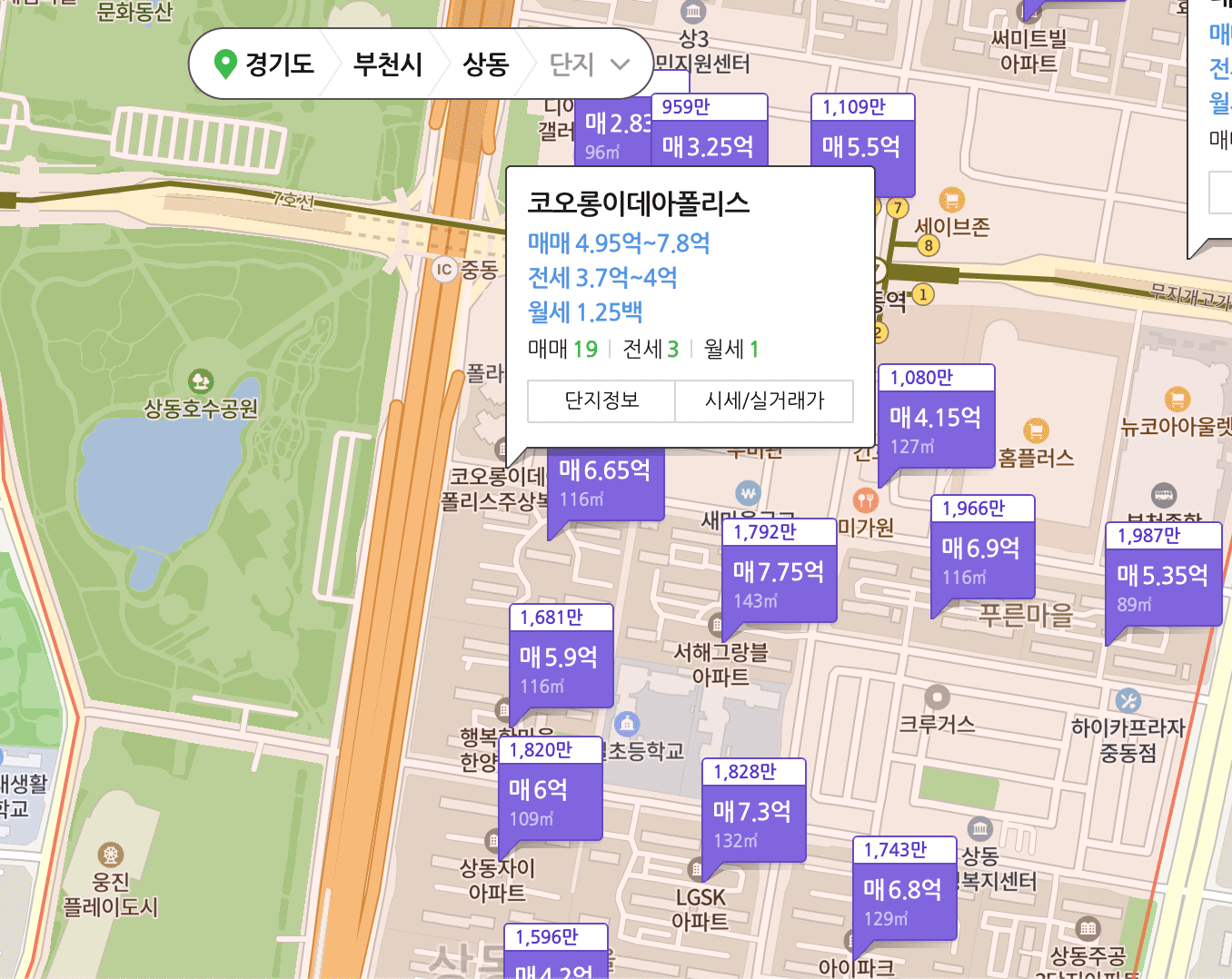 상동 호수공원이 보이는 부천 이데아폴리스 주변 아파트 시세