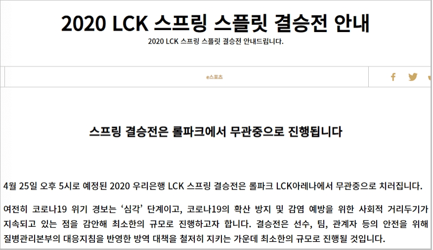 스피링 결승전은 롤파크에서 무관중 진행 됩니다. (코로나 바이러스 확산방지차)