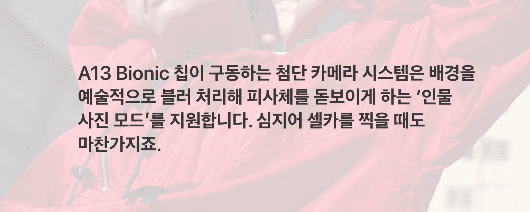 A13 Bionic 칩이 첨단 카메라 시스템은 배경을 예술적으로 블러 처리해 피사체를 돋보이게 하는 '인물사진모드'를 지원합니다. 셀카찍을때 역시 마찬가지 입니다.