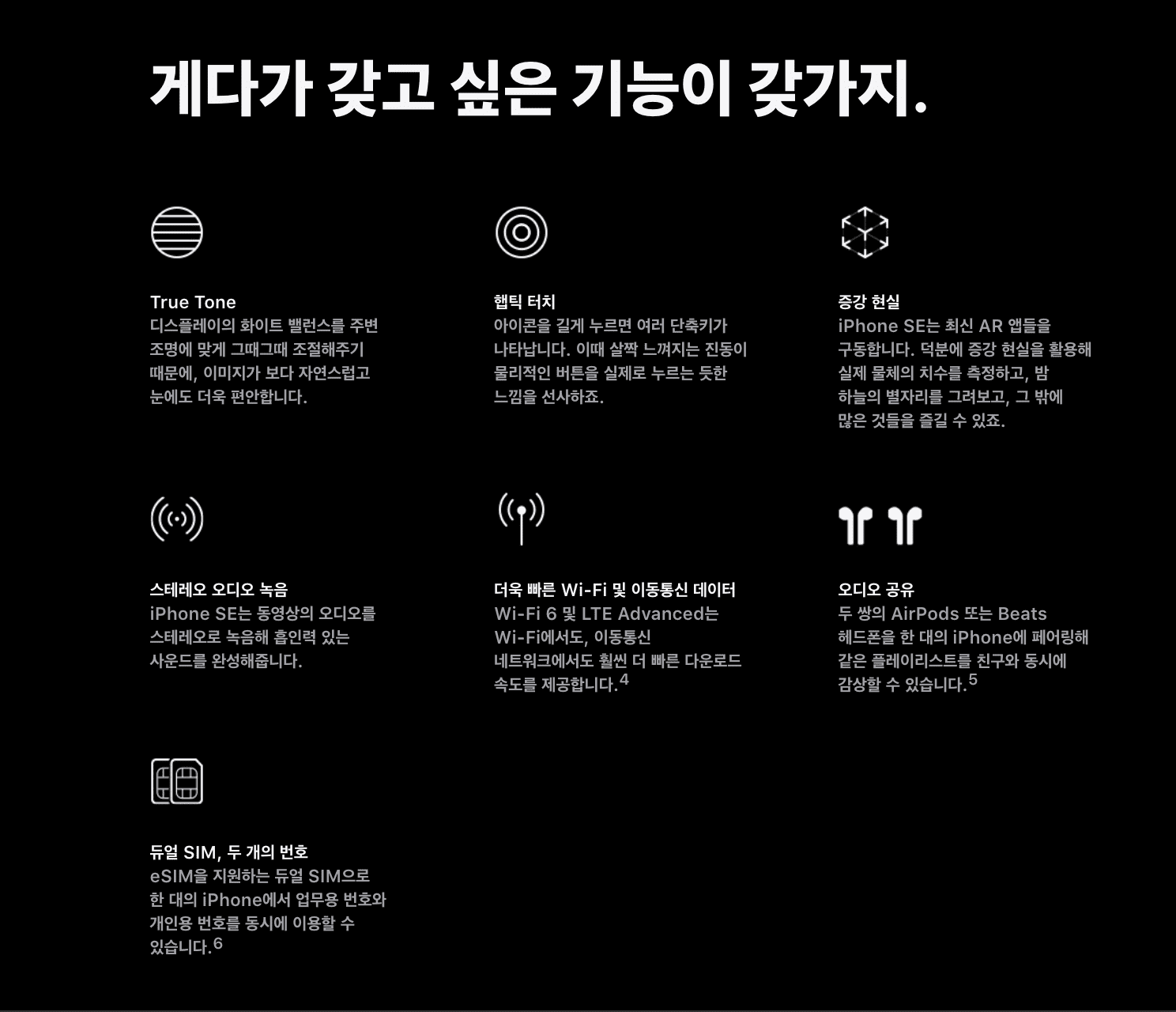 아이폰SE2 의 바디는 아이폰6의 바디에 성능은 아이폰(iphone) 11pro 이상의 성능을 탑재 하고 있습니다. A13 Bionic 칩의 장착으로 앱실행도, 최신게임 플레이도, 증강현실 등 모든 면에서 압도적인 성능을 자랑합니다.